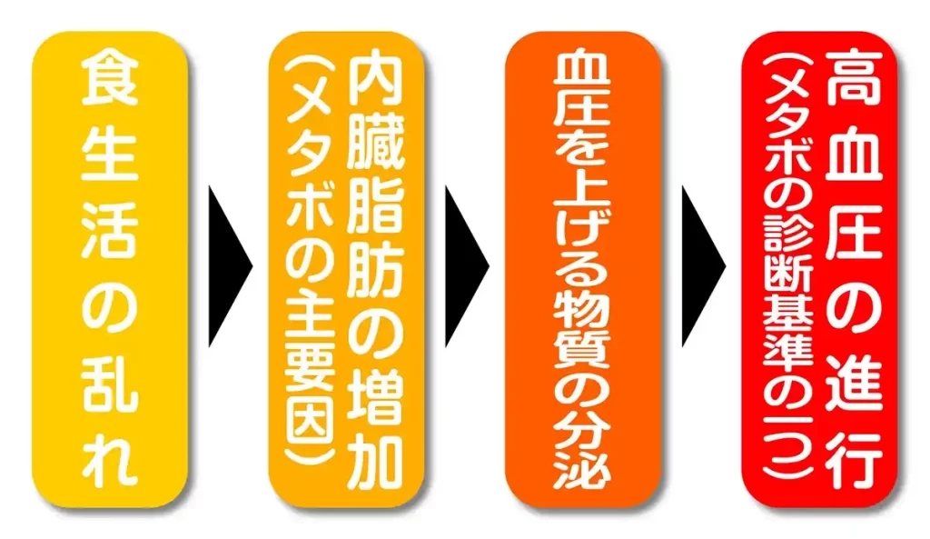 話はここで終わりません。増えた内臓脂肪は、血圧を上げるホルモンを分泌したり、血管の機能を低下させたりします。これにより、高血圧がさらに悪化するという悪循環が生まれます。