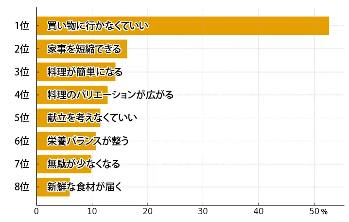 あらかじめ決められた献立や、サービス側からの提案があることで、「毎日メニューを考える大変さから解放された」という意見も見られます。 - 6位:栄養バランスが整うと感じる