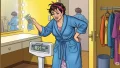 マンションの一室、ヨガマットの上でストレッチを行いながら筋肉痛に顔をゆがめている小太りの女性